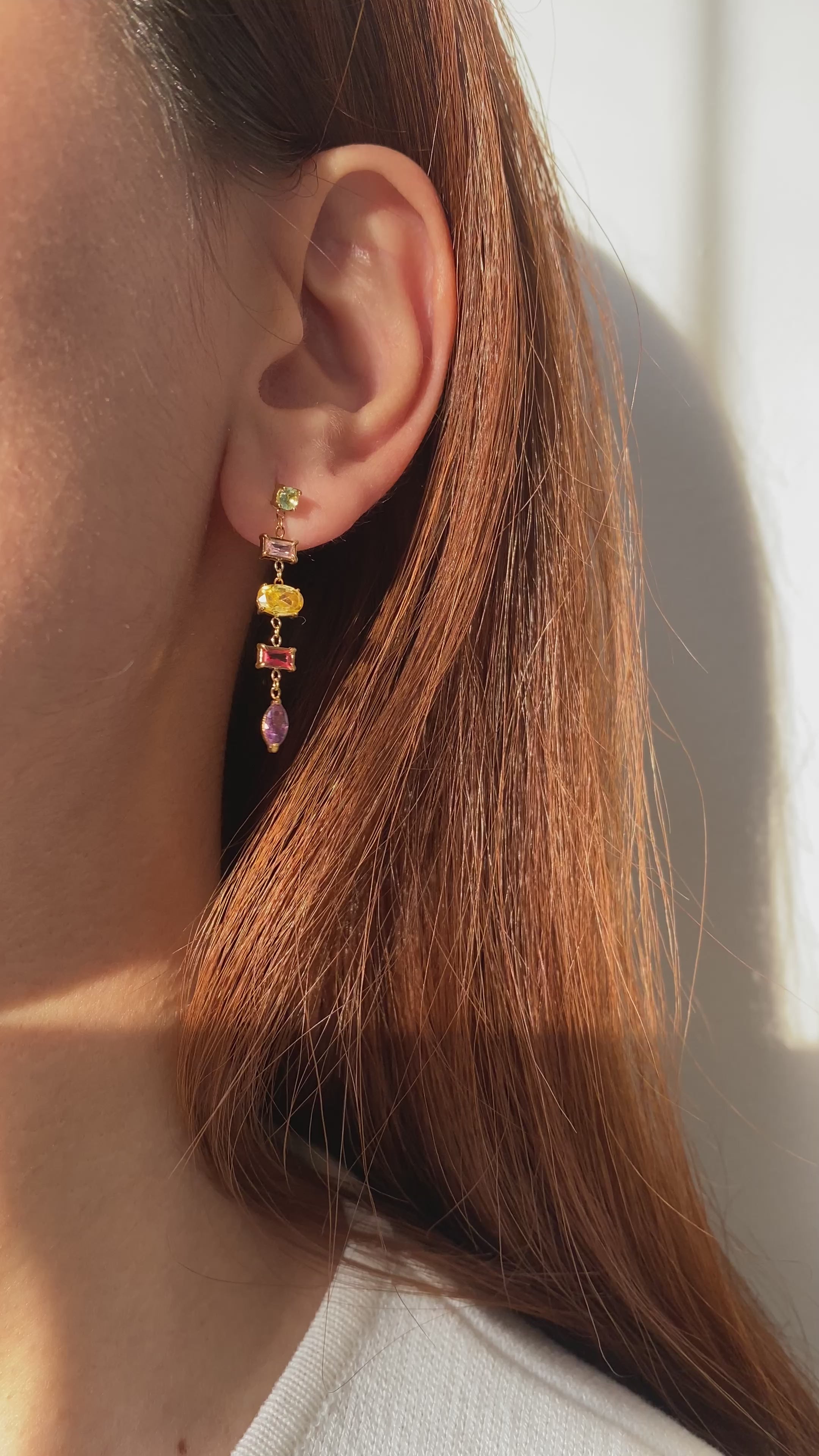 Add a burst of color and elegance to your look with these stunning Multi Gemstone Dangle Earrings! Crafted from 18K gold plated stainless steel, these dainty earrings feature a vibrant mix of baguette, oval, round, and marquise-cut gemstones in rich hues of green, pink, yellow, red, and purple. With a 3cm drop length, these lightweight earrings bring a perfect touch of sparkle and color to any outfit, making them ideal for both special occasions and everyday glam. The combination of colorful stones creates a unique, eye-catching design that will make these earrings your new go-to favorite.
