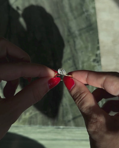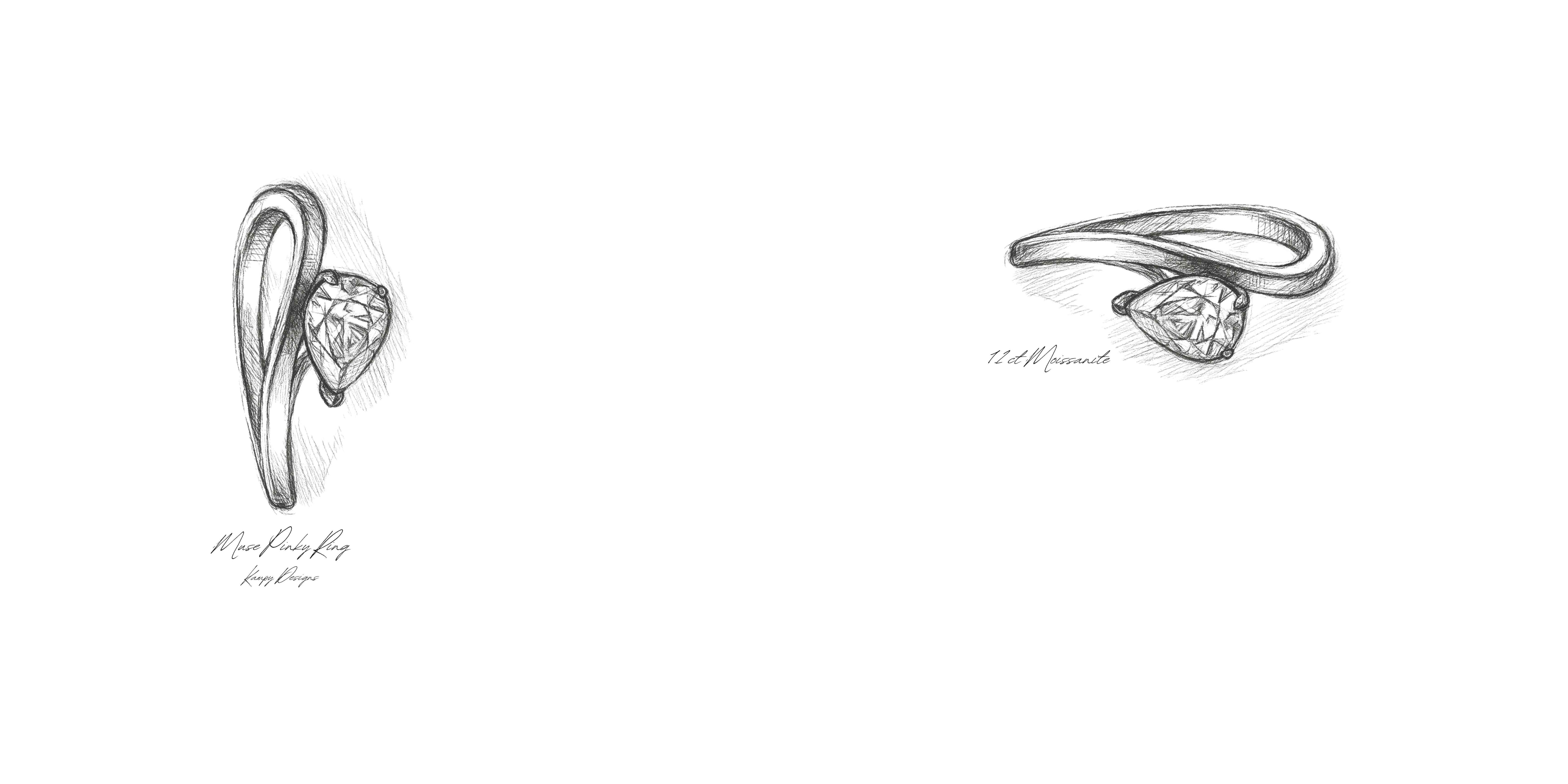 The Muse Pinky Ring features a pear-shaped moissanite that appears to float within a curved band, creating a clean, architectural silhouette. Designed to feel minimal yet distinctive, it’s a unique moissanite solitaire often worn as a pinky ring or styled solo for an understated, modern look.