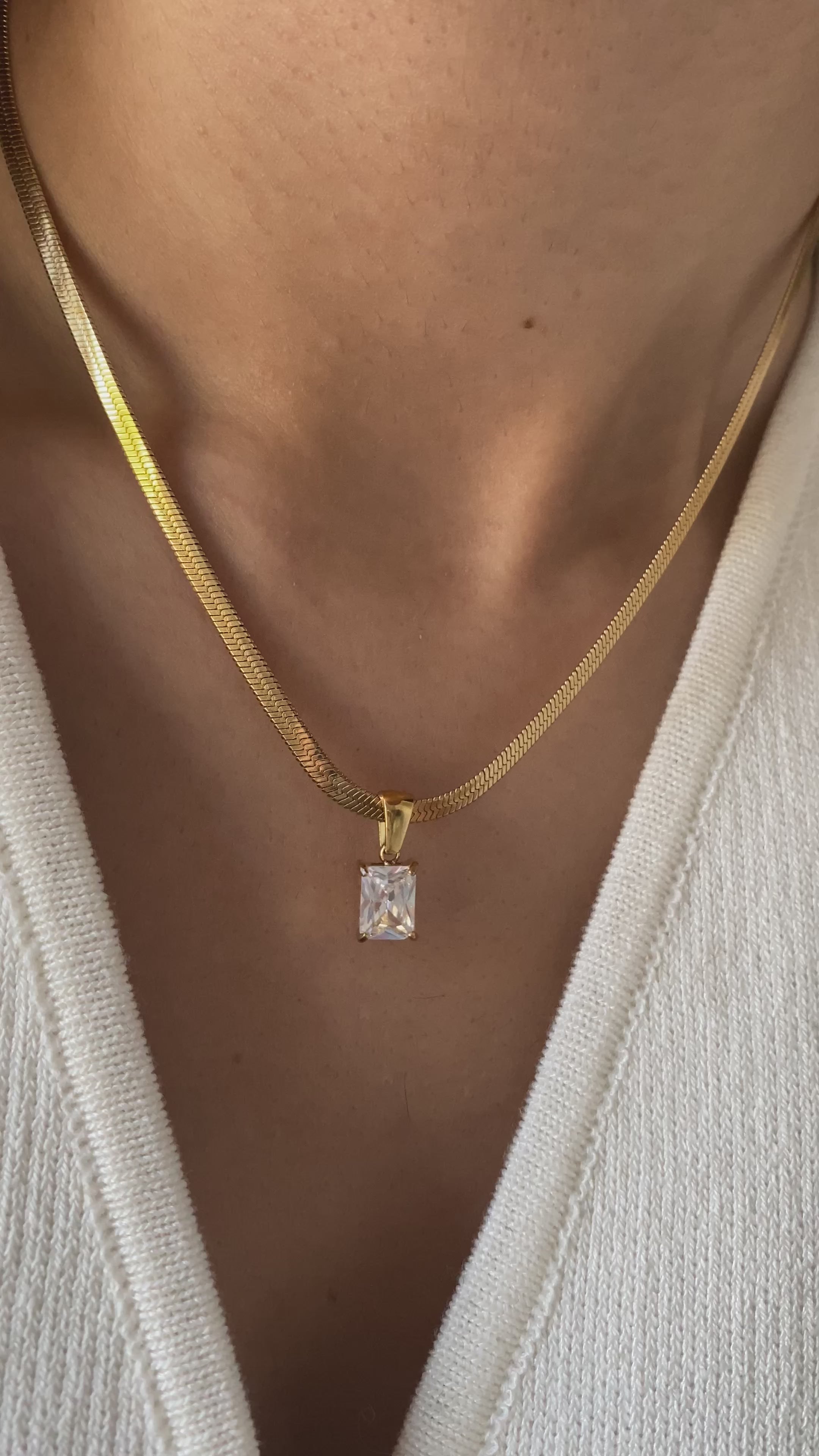 Add a touch of timeless elegance with this stunning Emerald Cut Diamond Necklace. Featuring a 6mm x 7mm zircon stone set in a chic gold snake chain, this necklace is crafted from 18K gold plated stainless steel and designed to be waterproof, ensuring lasting beauty. The 3mm thick chain is perfect for layering or wearing solo for a sophisticated look, with a length of 36cm plus a 5cm extender to customize the fit. Whether you're wearing it for a special occasion or adding it to your everyday jewelry collection, this piece brings a touch of luxury to any outfit.